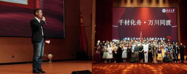 终章“星辰与诗”将晚会推向高燃巅峰。首先,主题朗诵激情澎湃,以磅礴气势诉说对青年学子扎根祖国大地的殷切期望,字字铿锵,激荡人心。朗诵余韵犹存,材料科学与工程学院党总支书记吴钊峰发表主旨讲话,细腻梳理学子在校成长脉络,勉励毕业生恪守校训精神,怀坚定信念闯荡未来,勇敢拥抱机遇与挑战,为毕业生献上诚挚祝福。